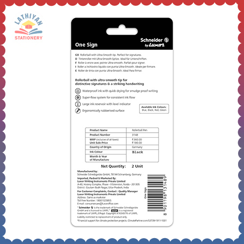 The Luxor Schneider One Sign Roller Ball Pen set includes 2 black ink pens with a 1.0 mm cone tip for a smooth and bold writing experience. Designed for long-lasting use, each pen offers up to 2000 metres of writing with a cap-off time of 2–3 days, ensuring no quick drying. Perfect for office work, note-taking, and everyday writing tasks.